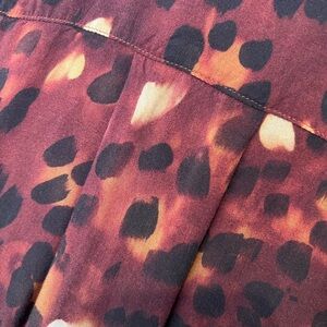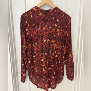 Beautifully soft button-down shirt. Rich orange, burgundy, brown tones. Longer at the back than front. Two breast pockets, and hidden buttons. Over sized, relaxed fit.