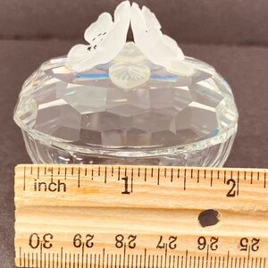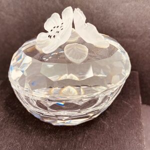 The beautiful vintage Swarovski trinket box is in excellent pre-owned condition. No chips or cracks. Glue-holding flowers have turned yellow due to vintage age,
