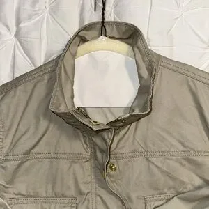 With its resin-coat this jacket isnt just a great look but it’s also perfect for a foggy morning or day of light rain. Gorgeous khaki color with gold snap buttons. Looks great dressed up or down.