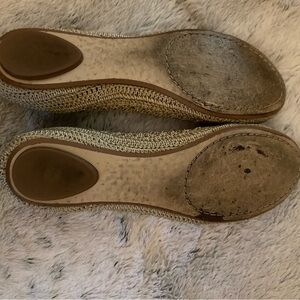 Great, well cared for preowned Nine West flat shoes - neutral colored fabric with leather soles.
