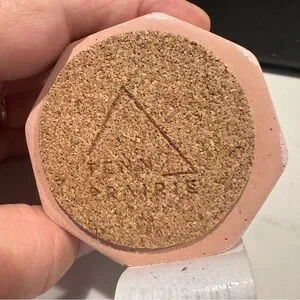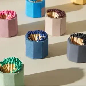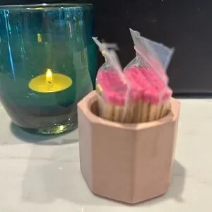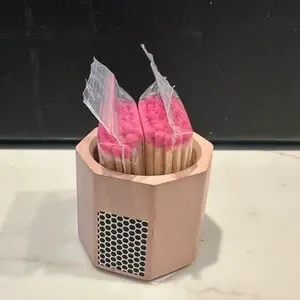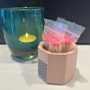 A super chic way to keep your matches handy. A rounded match holder made of concrete. With a match striker pad on the side. Cork bottom to protect surfaces. Includes 70 matches (2-35 packs). New and never used. Pet and smoke free home.