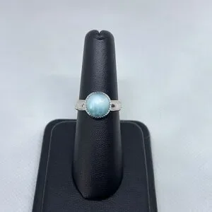 Larimar is best known to be a healing stone, but its metaphysical powers go much deeper. It has effects on four of the seven main chakras: the heart, the throat, the third eye and the crown chakra by healing and enlightening. Larimar helps stress-related imbalances, general anxiety and panic attacks. I bezel set the gemstone in .999 sterling silver around the gemstone and .925 for the backing and ring shank. I’m a one woman shop, I use the finest materials from long standing companies.