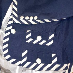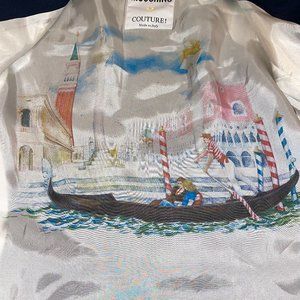 Gorgeous Moschino Couture jacket and skirt. Timeless design encapsulated in this two piece suit. Fabric is lightweight with a silky feel in a dark blue with white and blue striped trim. Jacket has four button flap (faux) pockets, notched collar, and three button front closure. Long sleeves have four button closure. Light shoulder padding is approximately .25” thick. The lining of jacket is an amazing Venice print featuring a gondolier and happy couple in front of a palazzo. Solid blue skirt is straight with a side zip and button closure. It is lined and has a 2” wide waistband.