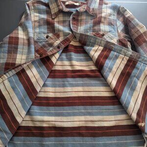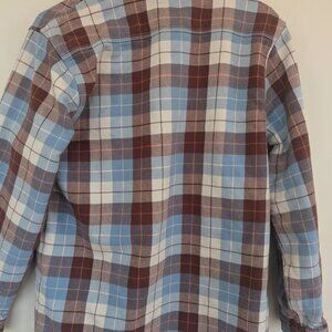 Nice Birdwell Beach Britches flannel in size Small. Brown and light blue plaid. I'm typically a size M and this fits me well (with the sleeves rolled up).