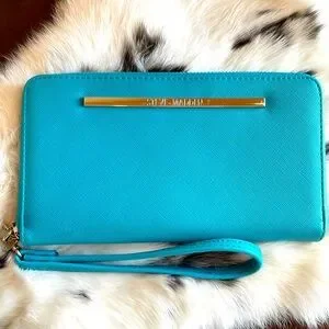 Preloved Steve Madden zip around wallet wristlet, detachable handle. Teal green with gold hardware including logo plate. Three sections for credit cards, center pocket with zipper. Approximately 8 x 5 inches. EUC!!