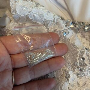Super cute two piece dress perfect for a homecoming, prom, or party dress! It was a sample gown for a bridal shop that closed for retirement. She does have a little damage but nothing that couldn’t be easily repaired! Everything is in the photos!