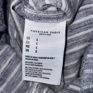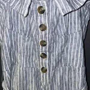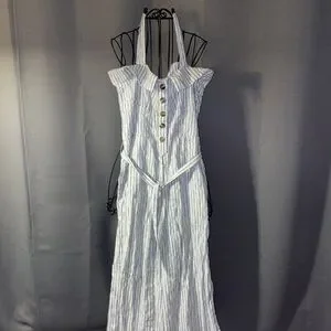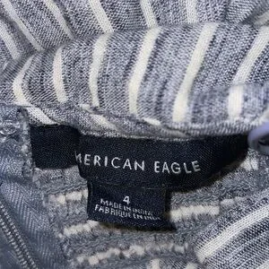 NWOT. American Eagle women’s jumpsuit size 4. Blue & white stripe, spaghetti straps, zipper in back, buttons down front. 66% cotton 34% polyester. Made in India. Length of jumpsuit is 55”. Smoke & pet free home.