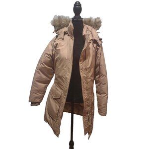 Snozu Down Feather Hooded Puffer Jacket Ski Coat Faux Fur Women's Size Small Tan Brown Removable Hood 2-Way Zipper ~ New