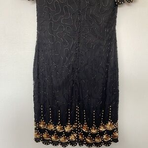 Description : Black and fully lined with intricate black and gold beadwork throughout. Short sleeves with shoulder pads. EUC.