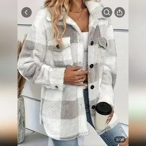 Buffalo Plaid Button Up Teddy Shacket Gray & White Checkered NWT