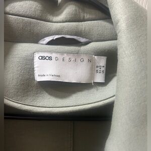 Muted mint green trench style coat by Asos. Worn once. Very light material, has pockets, no liner. Fabric unavailable. No buttons.