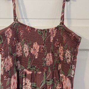 This is the absolute cutest, retro / Hawaiian-inspired midi sundress by AUW! It's a mauve color, so kind of a dusty pinky-purple, with a floral pattern. The dress features a padded, lined bust, adjustable spaghetti straps, a gathered back, a tie at the bust, and a faux button front (which lays flat unlike real buttons!).