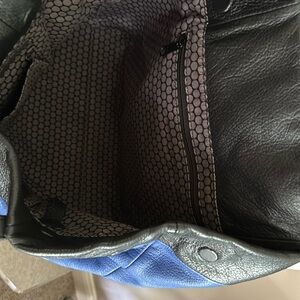 Brighton’s Klee is a very soft top grain pebble leather shoulder bag in bright blue and black with a long pewter colored ornamental tassel. The interior of the bag is Brighton’s ditsy dots gray and black fabric and has the traditional Brighton pocket system with key fob attachment. The outside back of the bag has a slit pocket. Side panels have magnet closure. Strap drop is 9”. It comes from a pet and smoke-free home, and with a Brighton dust cover.