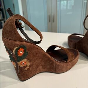 Gorgeous platform wedge suede Prada sandals. Beautiful butterfly appliqué motif. Excellent pre owned condition. Fits true to size. 37.5/7.5. I’m a size 7 and these work but just a tad extra room.