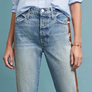 Crop capri pedal pusher wide leg hip hugger low slung hipster wide barrel leg relaxed baggy satin ribbon tuxedo vintage denim fray raw hem AMO LOVER BOY RIBBON JEANS A32262RB INDIGO ADOBE HIGH RISE DENIM