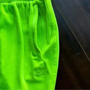 This ADIDAS ORIGINALS x JEREMY SCOTT velour skirt is very soft in a very bright neon yellow. There are drawstrings at the waist and pockets on both sides of the hips. There’s an embroidered ADIDAS logo that’s the same color below the left hip pocket. This skirt has been worn a few times with no flaws.