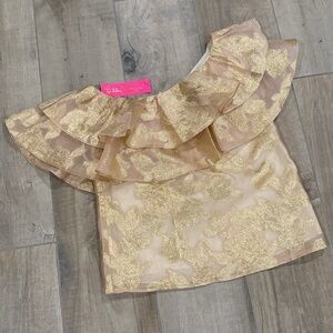 NWT Lilly Pulitzer Trixie One Shoulder Ruffle Top in Organza Brocade. Gorgeous one-shoulder top with sweeping double-layered ruffle across shoulders. Metallic golden/champagne threading adds glamour.