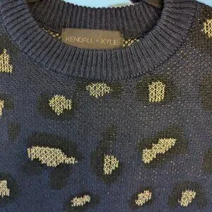 Kendall + Kylie Navy Blue Metallic Cheetah Sweater. Crew neck style with ribbed collar and hems. Dark navy blue with a metallic gold cheetah print pattern. Thick and cozy. Size Large.