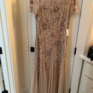 Adrianna Papell HAND BEADED SHORT SLEEVE FLORAL GODET GOWN in Beige gold