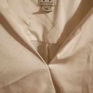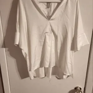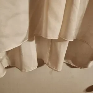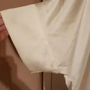 Short-sleeved, cream colored babydoll-style top with wide cuffed sleeves and hi-lo hemline. Like new condition.