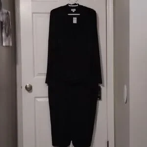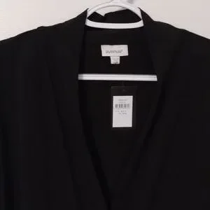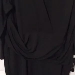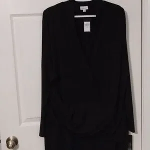 long sleeve black dress. Mock wrap dress. has draping across middle