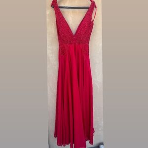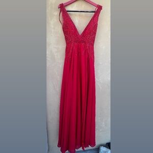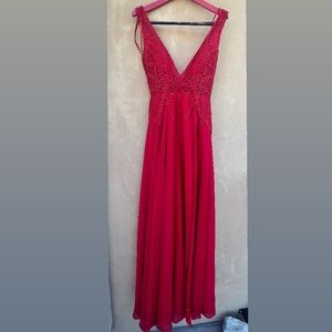Style: Gianni Bini gown, formal dress, prom dress, wedding guest, red carpet, elegant, showstopper, lace, slit dress, deep v neck, black tie, feminine, colorful, prom, wedding, special occasion, fancy, prom, nightgown.