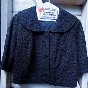 Adorable 40s/50s black eyelet jacket with like buttons. Crop length with larger rounded collar. Cotton, lined.