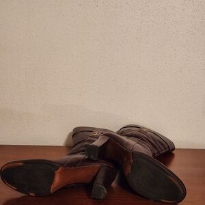 They're brown w/ a leather upper and man-made sole and foot bed. The zip up on the side. They have a 3.5" heel. Circumference is 15".