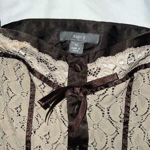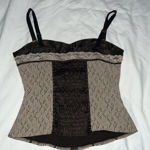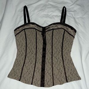 This popular Apt 9 corset top is so cute! Top was thrifted and is in worn condition. It’s a size Medium and is true to size. Top has brown lace, dark brown satin details, a mocked back, and a cinched waist.