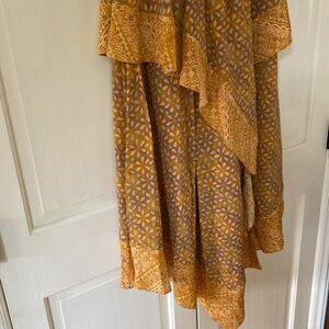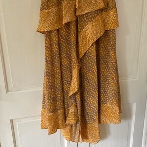 Midi length. Drawstring waistband. Flutter sleeves. Half button front. Cascading ruffles. 100% Silk. Fits true to size but see measurements below. Absolutely perfect for a fall wedding!