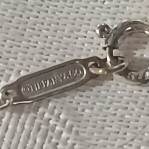 Lovely Tiffany & Co. Sterling Silver Heart Necklace. This piece has a nice open modern heart that hangs on the diagonal. This is on a thin 16 inch chain with spring ring clasp. The heart is stamped inside Tiffany & Co. 925. The chain is stamped on a tag by the clasp with Tiffany & Co. on one side and 925 on the other. This is in very good pre-owned condition with light scratching. This comes with Blue T&Co pouch as pictured.