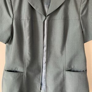 Style: Short Sleeve, Zipper Closure Top. Flat Front Pants, Side Zipper.