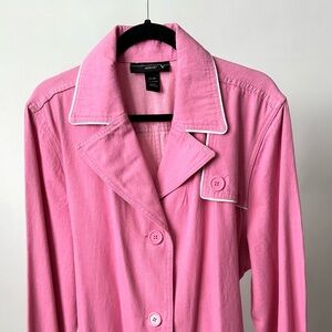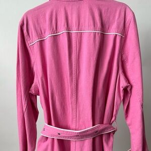 VINTAGE 2000s VENEZIA Chic Pink Short Trench Coat Size-18/20, can be worn by M-XL. Chic pink trench coat with white piped trim and perfect short length. Gorgeous pink lightweight cotton with matching belt to cinch in the waist and belted arm cuff detail. The trench can be worn by smaller sized for a stylish baggy oversized loose fit. I'm a size 8 medium and it's modeled on me! Perfect jacket for Fall/Winter~sophisticated and chic!