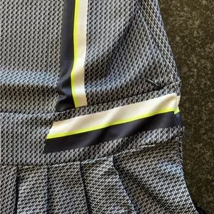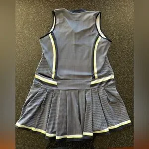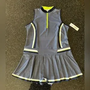 This dress is NWT from a smoke-free/pet-free home. It features two zippered pockets on the back of the dress and is 33.5 inches long according to the website. It is navy blue with neon accents. It is ideal for tennis or golf.