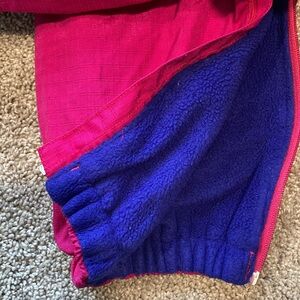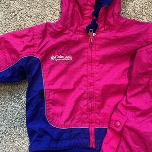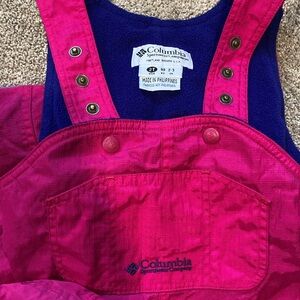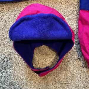 Pink & blue snow-pants with matching winter coat and hat. Good used condition. A couple of spots on the front of the coat (see pictures). Pants unzip at the legs for easy diaper change or bathroom breaks. Definitely has a vintage vibe!