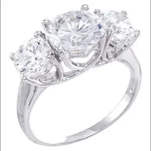 - Rhodium plated prong set faceted round-cut CZ triple stone ring