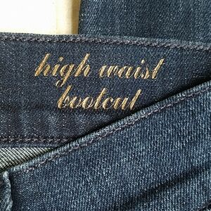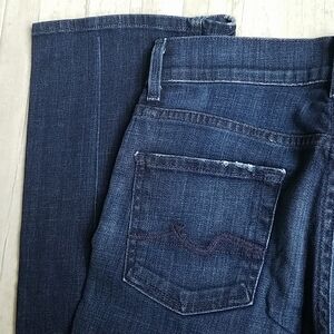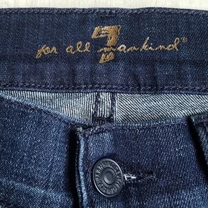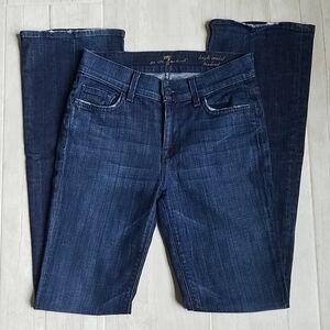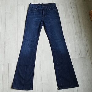 7 For All Mankind Size 26 High Waist Bootcut Blue Jean. Dark Wash. Cotton and elastane. Cuffs are slightly worn. Waist is 14 inches across. Inseam is 32.5 inches.