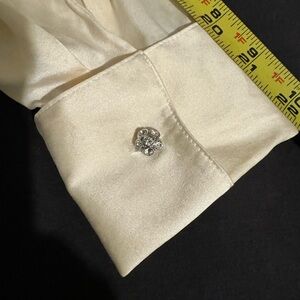Truly OOAK vintage stretch charmeuse blouse w flower (Camelia?) formed on chest. Darted to be fitted but easily worn a bit oversized~I do it w many! Incredibly high quality charmeuse woven silk. More off white than cream? Jeweled cuff link style buttons on double cuffs. TOTALLY in đź’śđź’ś just not my style