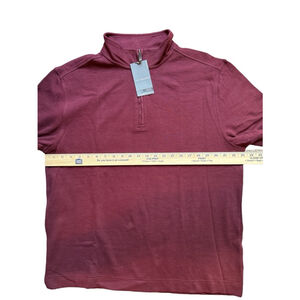 This is a new with tags Van Heusen men's long sleeve pullover. It is a size L/G, classic fit, and is made of 78% cotton and 22% polyester. The color is burgundy and the fabric has a subtle ribbed texture. The pullover has a quarter zip closure and a stand-up collar. The sleeves are long and the hem is straight. The pullover is machine washable. The measurements are as follows: Length: 28 inches, Chest: 23 inches, Sleeve: 26 inches. The pullover is in excellent condition and has no visible imperfections.