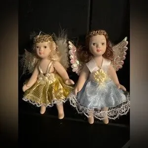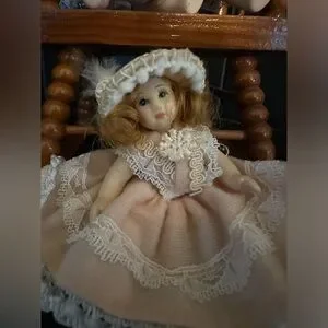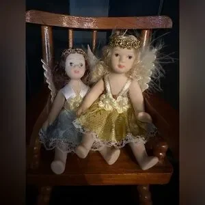 Set of 3 vintage porcelain dolls. Rocking chair sold separately.