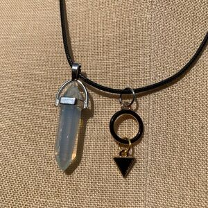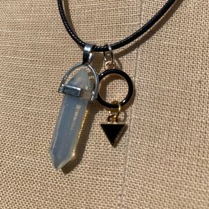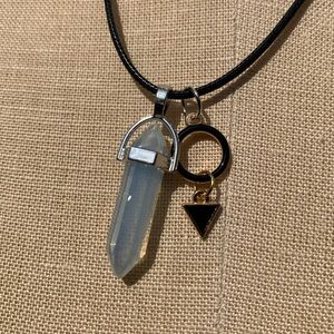 Handmade Dagger Opalite/Moonstone Resin Crystal Amulet Necklace & Triangle & Circle Charms on a black colored cord.