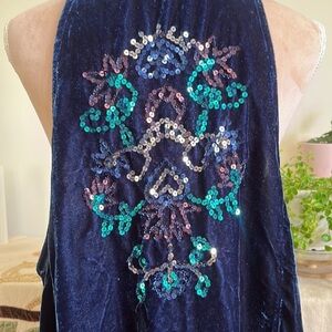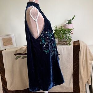 Free People Jill's Navy Blue Velvet Sequin Swing Dress! Luxe blue velvet, with an eye-catching blue, green, silver, and bronze sequin pattern across the front and back, create a high, halter neckline (with double button side closure) and relaxed, sleeveless bodice. Flirty swing silhouette.