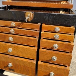 This is a 1930s-1940s National Cabinet Company Gertsner and Sons oak carry tool chest for dentists. I came into possession of this chest and document from it being left behind for trash. Dr. Victor De Frank earned his Doctor of Dental Surgery degree from Indiana University School of Dentistry in April of 1944. The framed Certificate and framed graduating class are not in great condition. They appear to have gotten wet over time. There are 10 drawers on the bottom and 3 slide out trays on top. The front piece that covers the drawers also slides under the drawers. Everything functions as it should. There is an expected amount of wear to the drawers and chest itself from years of use. The leather handle is in need of restoration but is still in tact. The key is with it, but it will not go all the way in. I don't want to break it, considering it's original. The chest is complete with all drawers and key. There are no tools with it. Please see pics for further item description. Sold as is.