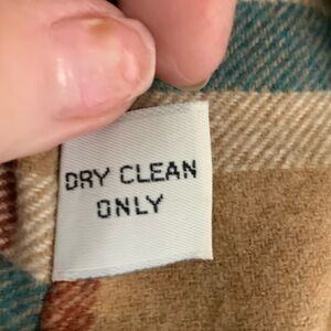 It has a front placket so buttons not visible when buttoned. It is size 16R. There are conflicting care tags on it one being dry clean only and another with washing instructions.
