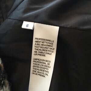Features: Zip front jacket with fuzzy, nubby tweed front panels. Sleeves and back are solid black. One inside pocket. Side Belted detail with button creates a cinched waist appeal. Dry clean.