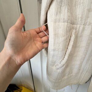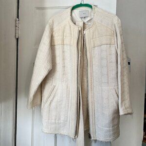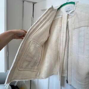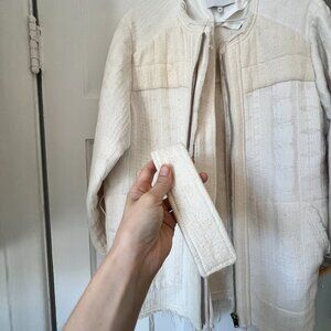 Beautiful two-tone cream evening jacket from IRO. Comes with self belt (not attached so it can be removed and worn without), as well as a zipper at the centre front. Spacious front pockets and beautiful craftsmanship inside and out. Great weight for fall or cool evenings in casual or formal events. Was dry cleaned and hasn't been worn since. True to size