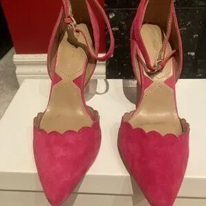 Pink Suede Dreams! | Adrienne Vittadini Fuchsia Pink Suede Shoes. Size 7. Adjustable thin ankle strap. Pointy toe, padded footbed. Stiletto heel 3.5” Gently worn.
