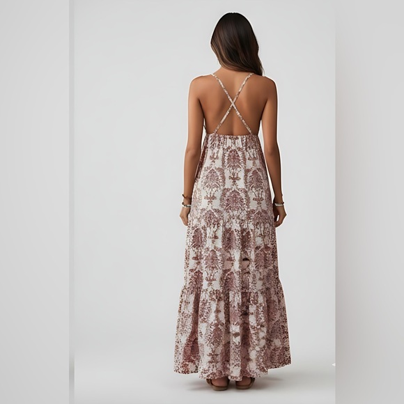 Boho Floral Print Sleeveless Cross-Front Maxi Dress Rust