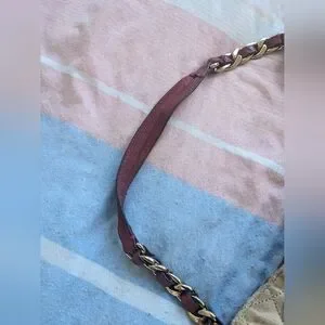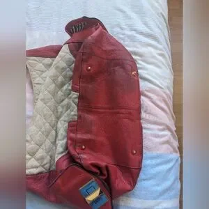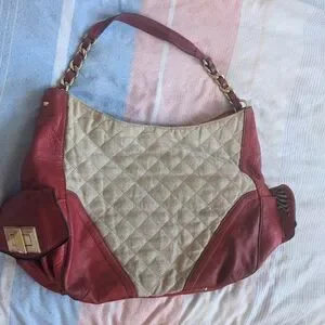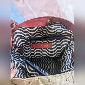 A red and beige quilted authentic Juicy Couture handbag with a gold chain strap. 2 side pockets, one zipper pocket on the inside, 2 smaller open pockets on the inside. The bag needs to be cleaned, some discolouration on the side pocket metal parts, but it's a very sturdy and spacious bag!
