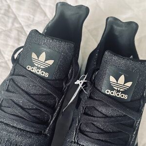 These rare Adidas Run Swift Sneakers in Core Black with Gold Sparkles are brand new, never worn! The lightweight EVA cushioning puts comfort under every step in an '80s-throwback running shoe reborn as a sporty, wear-everywhere sneaker. The knit sock upper sports embroidered stripes racing up the toe and around the heel to keep the look sleek and swift in any activity. Perfect for everyday wear! 🖤🤍///✨